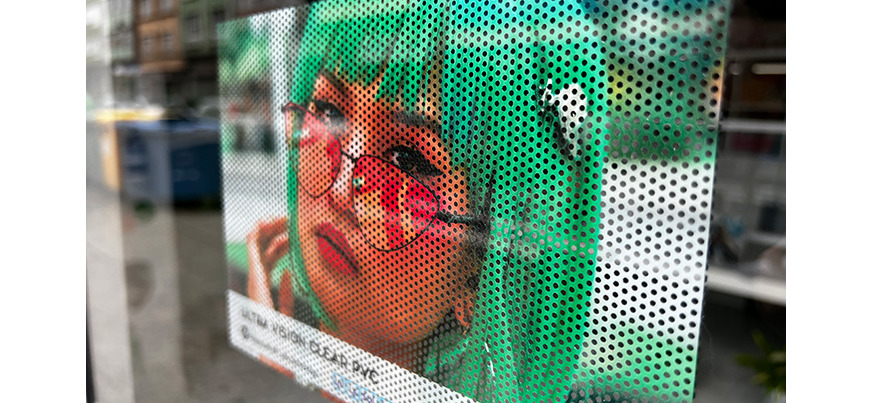 Vinilos adhesivos con micro agujeros para permitir el paso de la luz y facilitar la visibilidad desde el interior, utilizado habitualmente para la decoración de ventanas o escaparates.