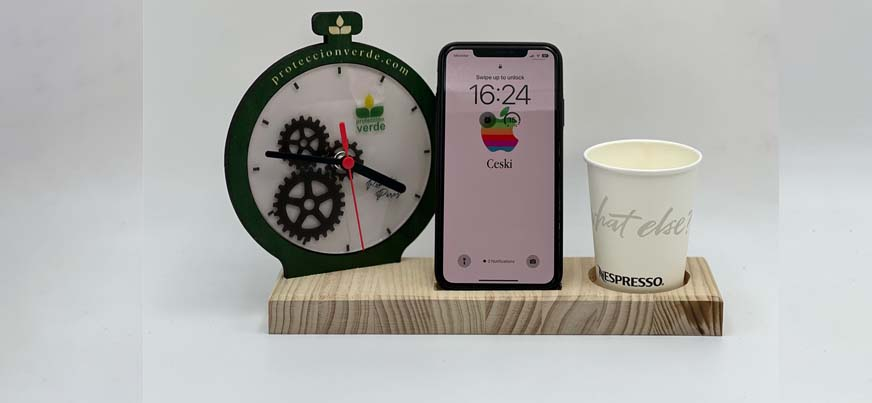 Organizador de escritorio personalizado con soporte para móvil, espacio para el café y opciones para reloj o tarjetas de visita. Fabricado en madera y materiales ecológicos. Perfecto como regalo de empresa para clientes y proveedores.