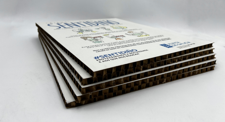 Soporte rígido y 100% reciclable, un material ecológico impreso con tintas UV de gran calidad y formado por una estructura hexagonal que recuerda a un panel de abeja.