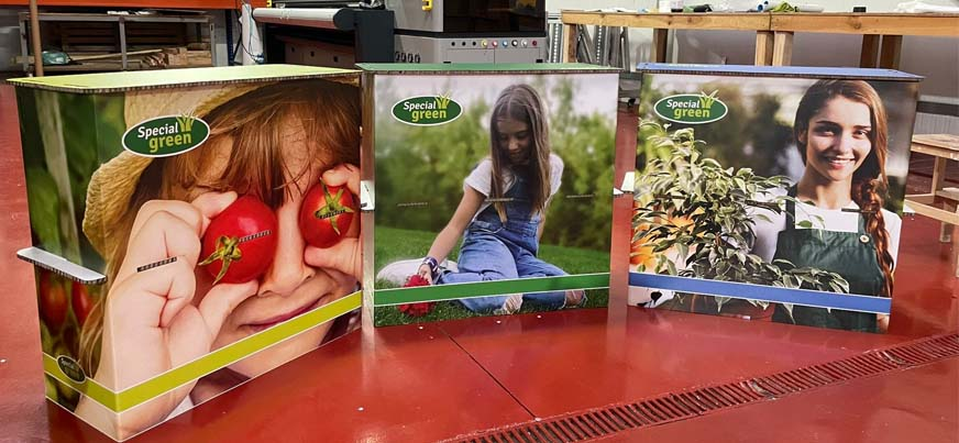 Ambos mostradores son personalizables, económicos y ecológicos ya que está fabricado con materiales sostenibles e impreso con tintas respetuosas con el medio ambientes.