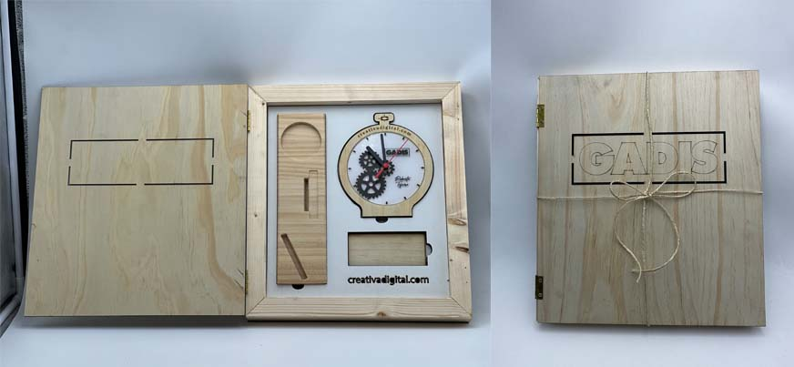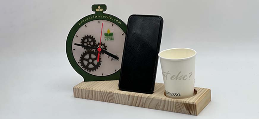 Organizador de escritorio personalizado con soporte para móvil, espacio para el café y opciones para reloj o tarjetas de visita. Fabricado en madera y materiales ecológicos. Perfecto como regalo de empresa para clientes y proveedores.